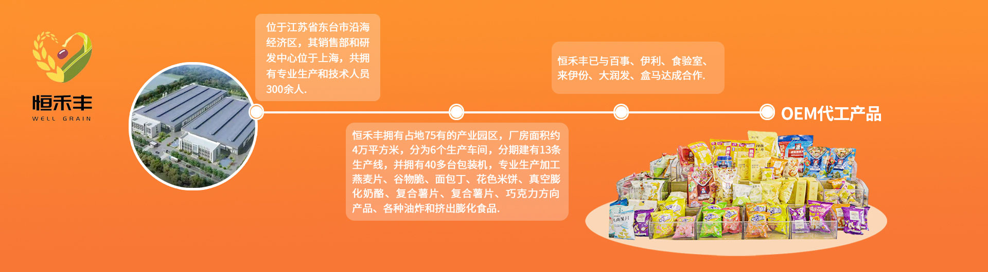 目前,恒禾豐擁有占地75畝的產(chǎn)業(yè)園區(qū),廠房面積約4萬平方米,分為6個生產(chǎn)車間,分期建有13條生產(chǎn)線,并擁有40多臺包裝機,專業(yè)生產(chǎn)加工燕麥片、谷物脆、面包丁、花色米餅、低溫真空膨化奶酪及果蔬、各種油炸和擠出膨化食品。
